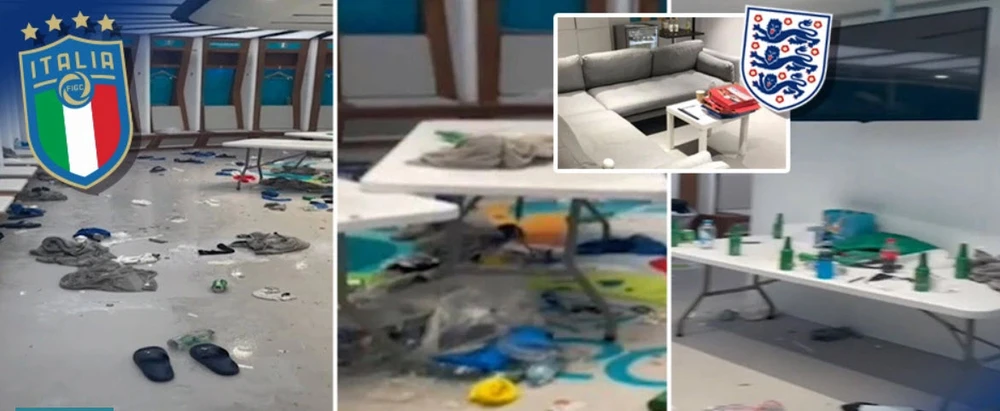 Hình ảnh tương phản bên trong phòng thay đồ của tuyển Ý và Anh. ẢNH: THE SUN