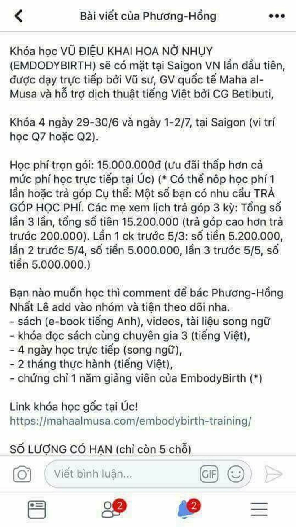 Về phương pháp sinh thuận tự nhiên, trên mạng xã hội cũng đang có nhiều quảng cáo các khóa học này, khóa gần nhất tổ chức cuối tháng 6, đầu tháng 7 sắp tới ngay tại TP.HCM, giá khóa học là 15 triệu đồng nếu trả tiền một lần, trả góp giá là 15,2 triệu đồng, cho khóa học có tên "Khai hoa nở nhụy - vũ điệu thuận tự nhiên".