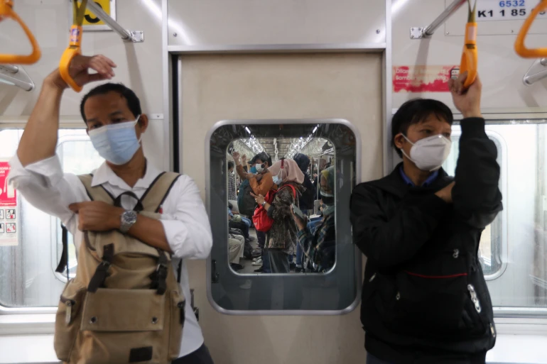 Người dân Indonesia đeo khẩu trang phòng chống dịch khi sử dụng phương tiện giao thông công cộng. Ảnh: EPA-EFE
