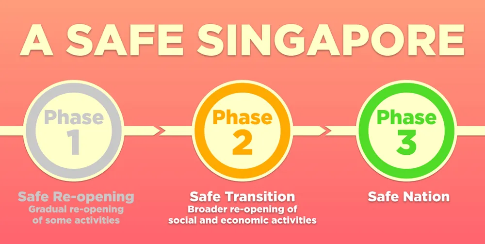 Ngày 2-6-2020, Singapore bắt đầu lộ trình mở cửa trở lại khi số ca nhiễm giảm 1/3 so với mức đỉnh điểm gần 1.500 ca một ngày cách đó sáu tuần. Lộ trình gồm 3 giai đoạn là Giai đoạn 1 - Safe Re-opening (Mở cửa trở lại an toàn), Giai đoạn 2 - Safe Transition (Chuyển tiếp an toàn) từ ngày 19-6-2020 và Giai đoạn 3 - Safe Nation (Đất nước an toàn) từ ngày 28-12-2020.