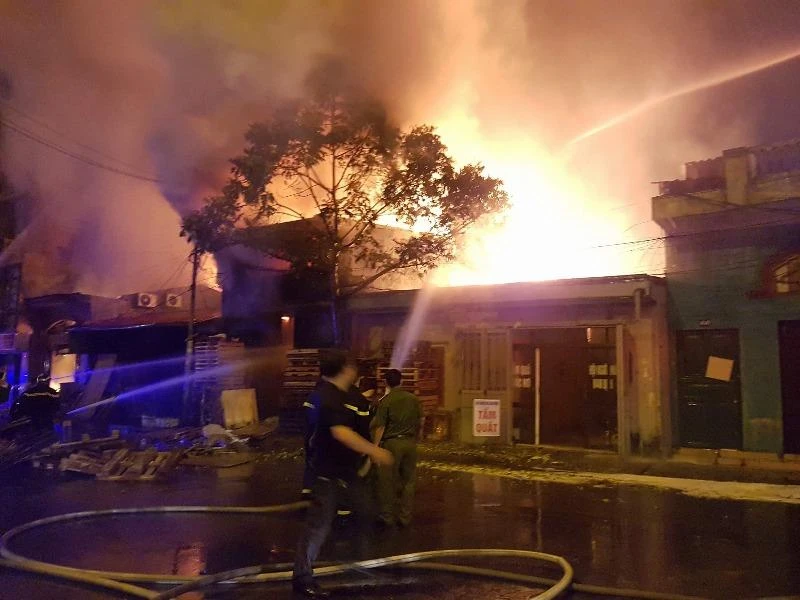 Đám cháy xuất phát từ nhà kho chứa gỗ và nhựa cao bản nhanh chóng lan rộng ra bốn nhà xung quanh, phát thành cột lửa kèm khói đen bốc cao ngùn ngụt.