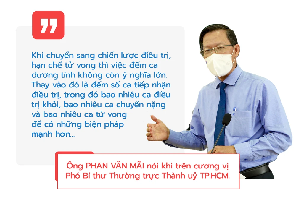 Đề cập đến chiến lược này hôm 3-8, ông Phan Văn Mãi - khi đó trên cương vị Phó Bí thư Thường trực Thành uỷ TP.HCM, cho rằng TP xác định chuyển sang chiến lược điều trị, hạn chế tử vong. Thay vì đếm ca đương tính thì đếm số ca tiếp nhận điều trị, trong đó bao nhiêu ca điều trị khỏi, bao nhiêu ca chuyển nặng và bao nhiêu ca tử vong để có những biện pháp mạnh hơn nhằm ngăn chặn chuyển nặng, hạn chế ca tử vong.