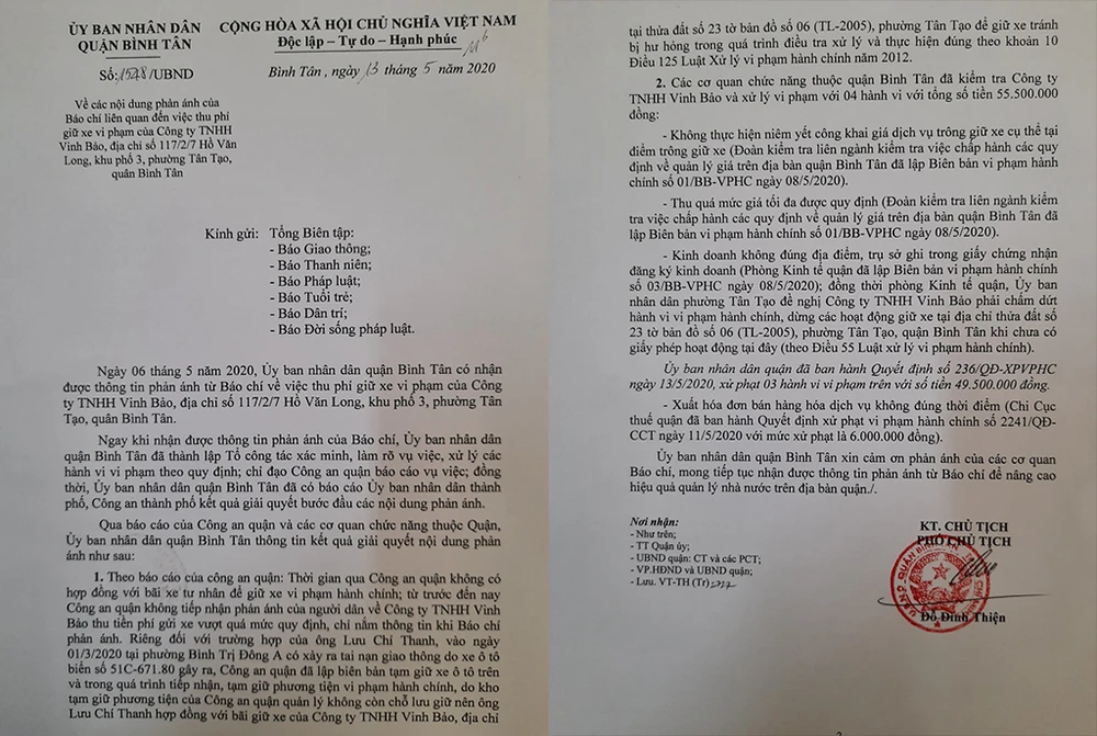 Sau khi nhận được phản ánh và vào cuộc xác minh, kiểm tra Công ty TNHH Vinh Bảo, UBND quận đã xử lý vi phạm bốn hành vi với tổng số tiền 55.500.000 đồng. Các hành vi sai phạm bao gồm: không thực hiện niêm yết công khai giá dịch vụ trông giữ xe cụ thể tại điểm trông giữ xe, thu quá mức giá tối đa được quy định, kinh doanh không đúng địa điểm, trụ sở, xuất hóa đơn bán hàng hóa dịch vụ không đúng thời điểm.