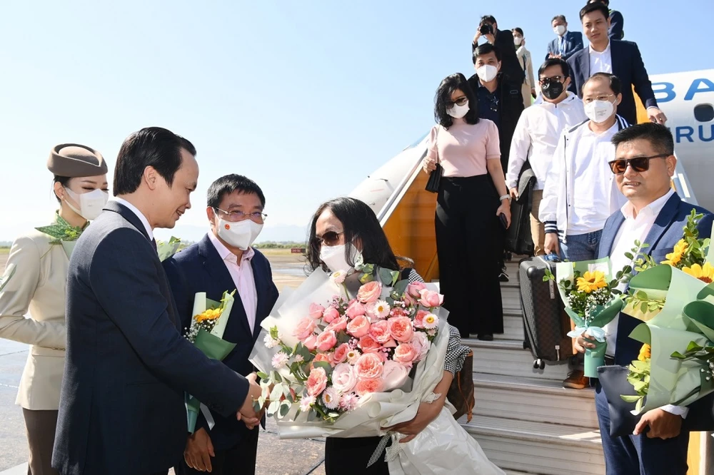 Lãnh đạo hãng hàng không Bamboo Airways tặng hoa cho những hành khách đầu tiên trên chuyến bay.