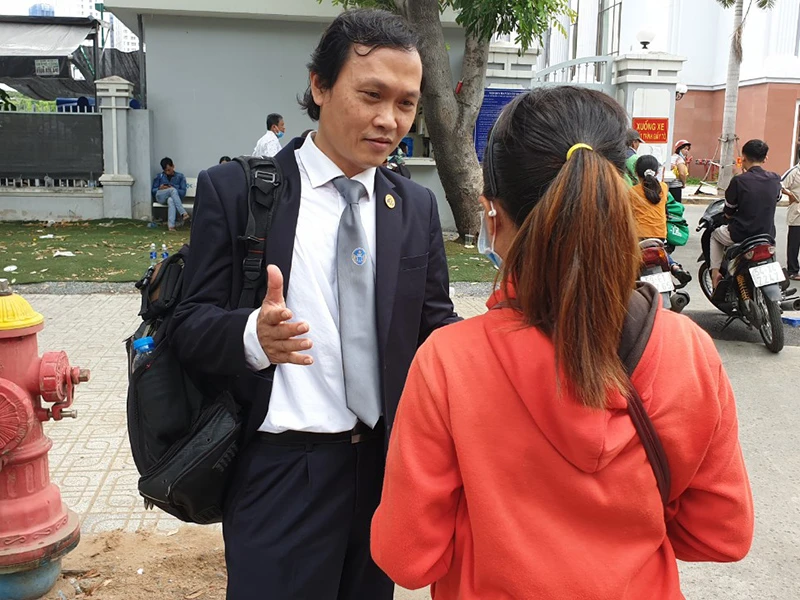 Chị L. trao đổi với luật sư sau phiên tòa phúc thẩm. Ảnh: CÙ HIỀN