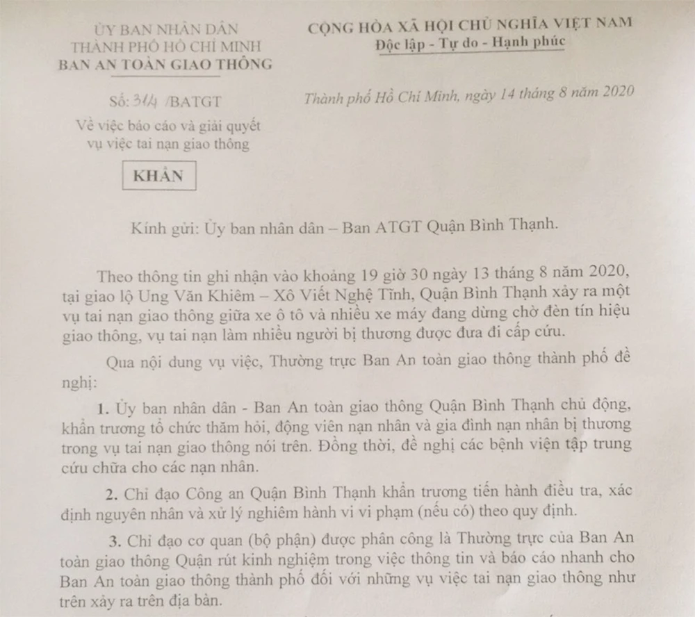 Liên quan đến vụ xe ô tô lùa nhiều xe máy tại giao lộ Ung Văn Khiêm và Xô Viết Nghệ Tĩnh (phường 25, quận Bình Thạnh) vào tối 13-8, Ban an toàn giao thông (ATGT) TP.HCM có công văn khẩn gửi UBND - Ban ATGT quận Bình Thạnh.