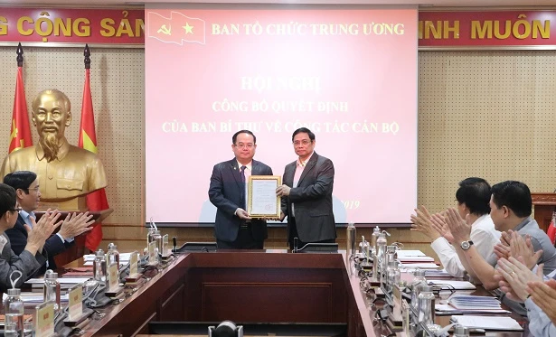 Ông Phạm Minh Chính - Trưởng ban Tổ chức Trung ương trao quyết định bổ nhiệm cuả Ban Bí thư cho tân phó Ban tổ chức. CTV