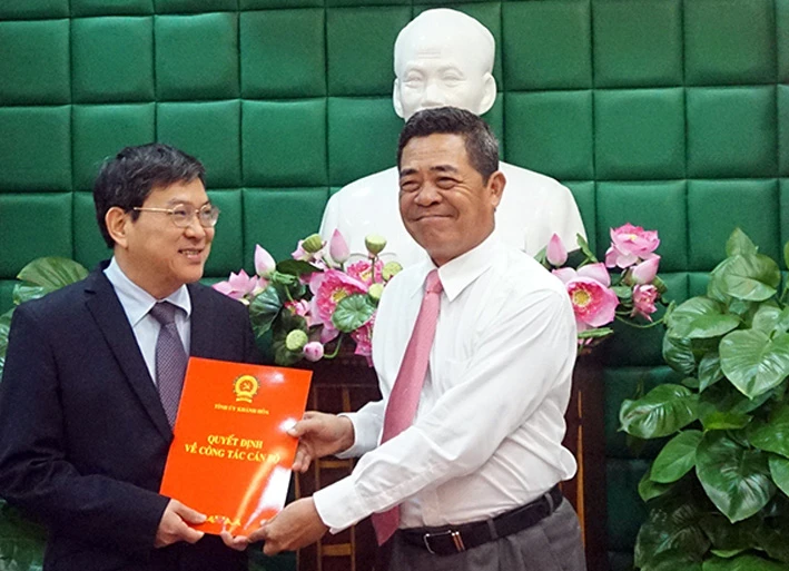 Ông Lê Thanh Quang, Bí thư Tỉnh ủy Khánh Hòa (phải) trao quyết định của Ban Bí thư cho ông Nguyễn Duy Bắc. Ảnh: K.N/KHO