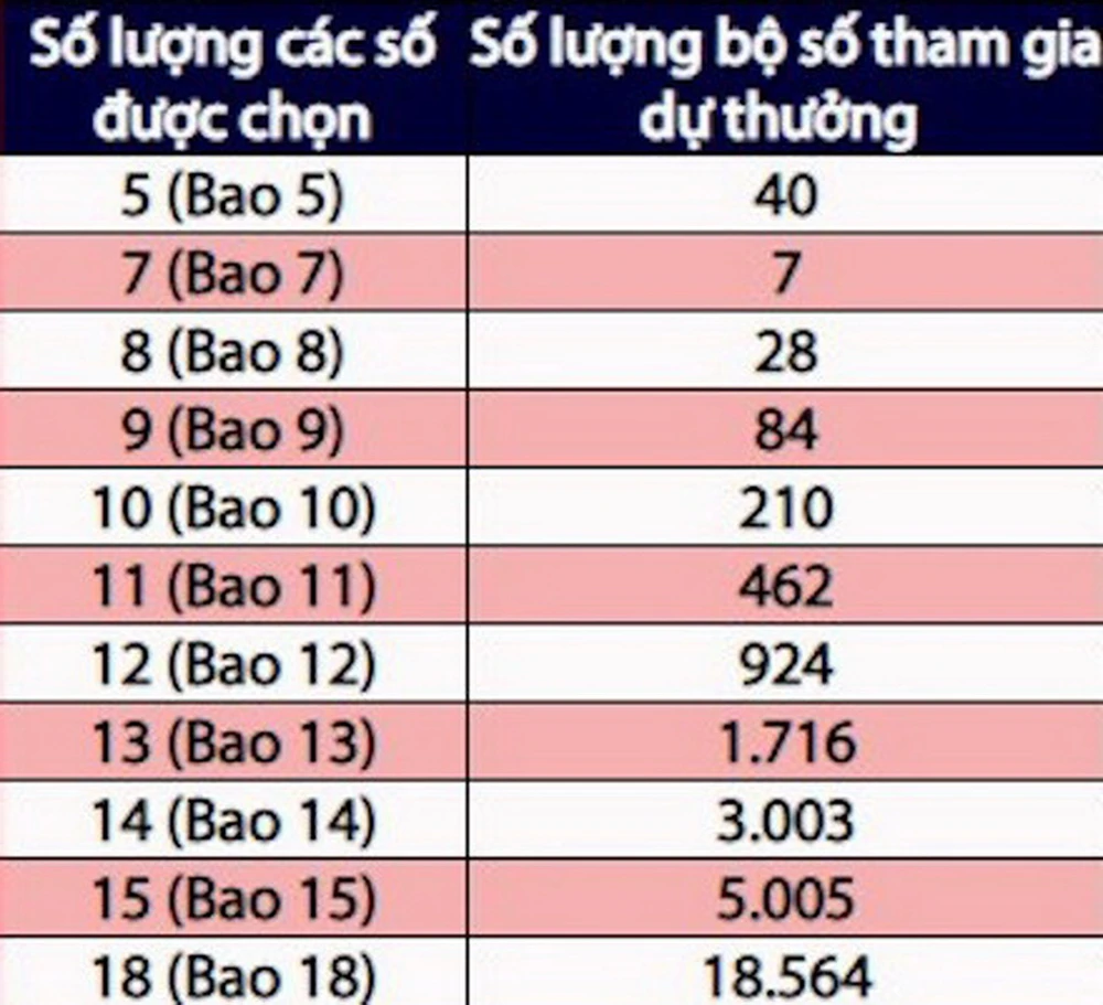 Cụ thể, để tăng cơ hội trúng thưởng một chương trình xổ số, người chơi có thể mua nhiều hơn 1 tấm vé hay 1 bộ số. Đối với xổ số tự chọn, Vietlott đơn giản hóa điều này bằng hình thức vé bao - từ “bao 5” tới “bao 18”. Trong đó, “bao 5” là chọn 5 con số cố định cho máy tính hoàn chỉnh từ các con số còn lại trong kho số, “bao 8” là chọn 8 con số để tạo thành 28 bộ số, “bao 9” là chọn 9 con số để tạo thành 84 bộ số dự thưởng… tương đương bạn sẽ gia tăng thêm xác suất trúng thưởng.