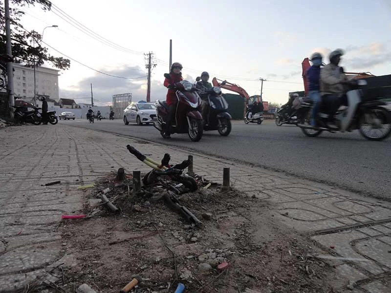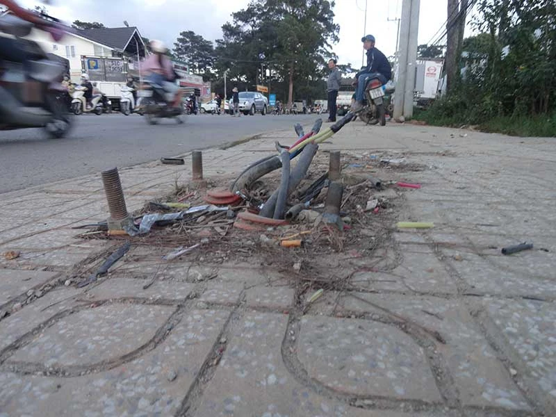 Vỉa hè trên đường Hùng Vương, thuộc phường 9, TP Đà Lạt, Lâm Đồng có hai trụ đèn gãy đổ đã từ lâu nay, để lại hiện trường là hai chân trụ trơ những cọc sắt và những sợi dây điện nguy hiểm.