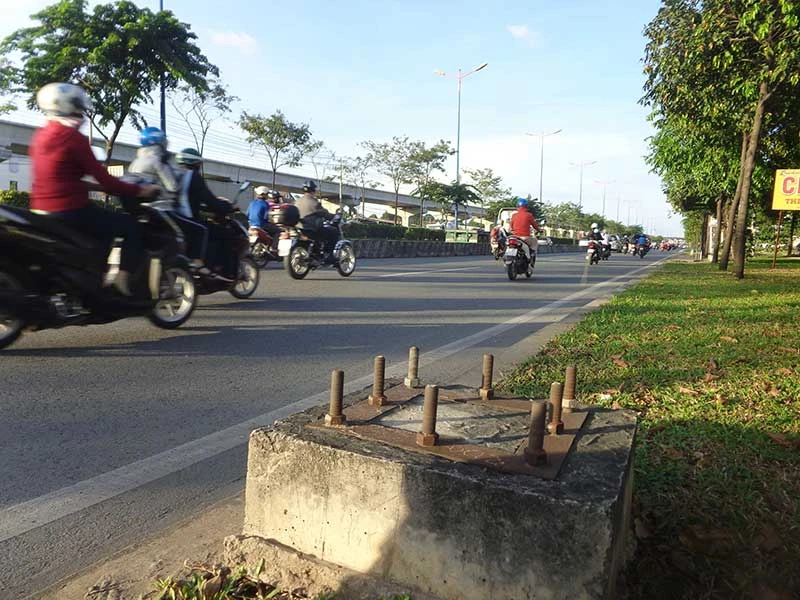 Trụ bảng chỉ đường đã được tháo từ rất lâu (vì thay đổi tuyến đường) nhưng chân trụ vẫn để nguyên. Những thanh sắt nhô lên như bàn chông thế này rất nguy hiểm cho người đi đường, đặc biệt là người khiếm thị.