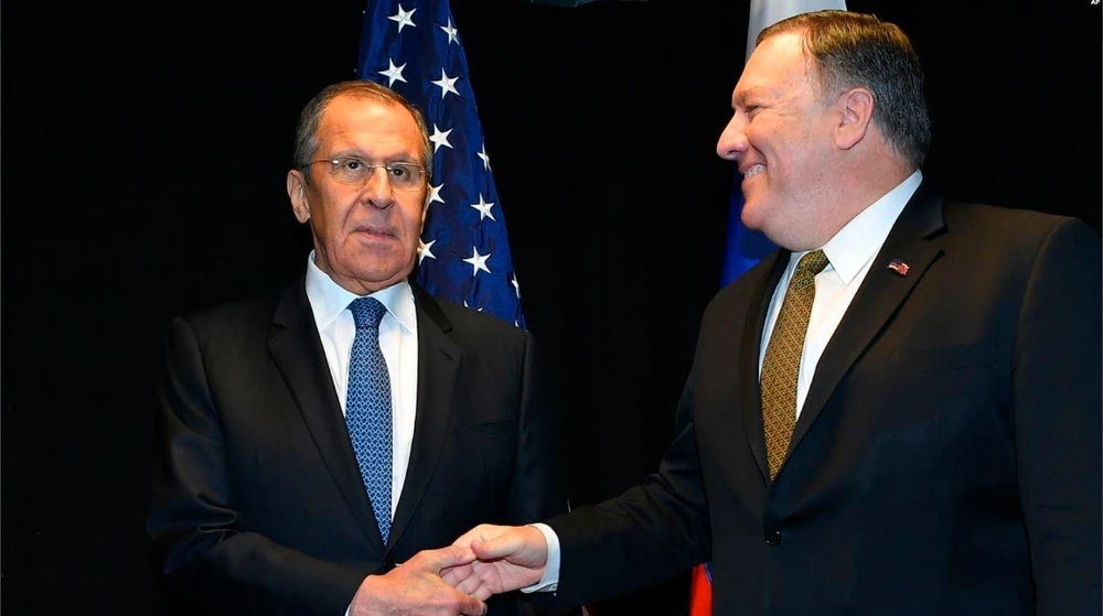 Ngoại trưởng Mỹ Mike Pompeo và người đồng cấp Nga Sergei Lavrov (bên trái) bên lề Hội nghị Hội đồng Bộ trưởng về Bắc Cực tại Phần Lan ngày 6-5. Ảnh: AP