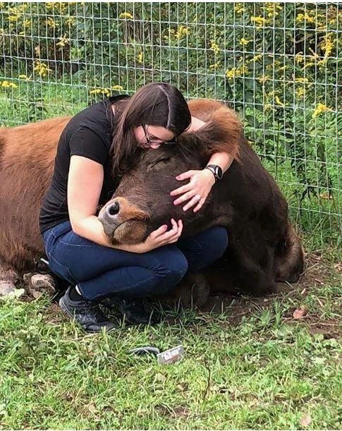 Con bò có vẻ cũng rất hạnh phúc khi được ôm ấp bởi những vị khách. Ảnh: INSTAGRAM