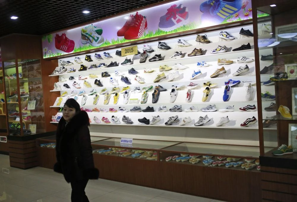 Một hướng dẫn viên đứng trong một phòng trưng bày sản phẩm ở nhà máy giày Ryuwon hôm 1-2. Ảnh: AP
