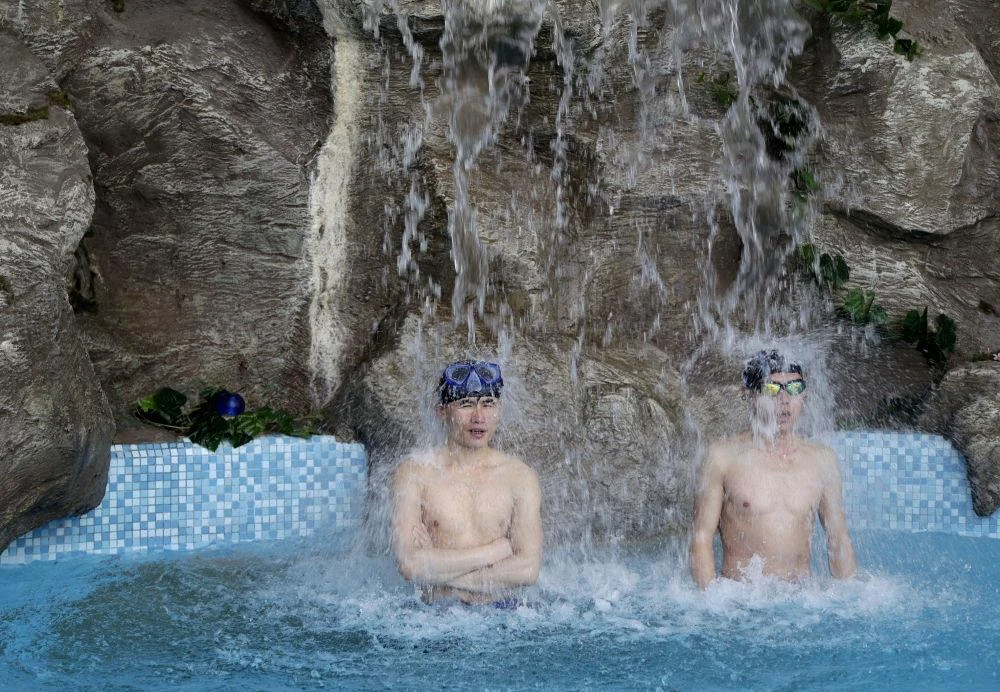 Người dân Triều Tiên tắm dưới thác nước nhân tạo tại một bể bơi ngoài trời ở Bình Nhưỡng hôm 11-3. Ảnh: AP