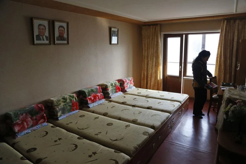 Căn phòng tập thể dành cho công nhân nhà máy dệt. Trên tường treo chân dung hai cố lãnh đạo Triều Tiên là Kim Nhật Thành và Kim Jong-il. Ảnh chụp ngày 30-1.