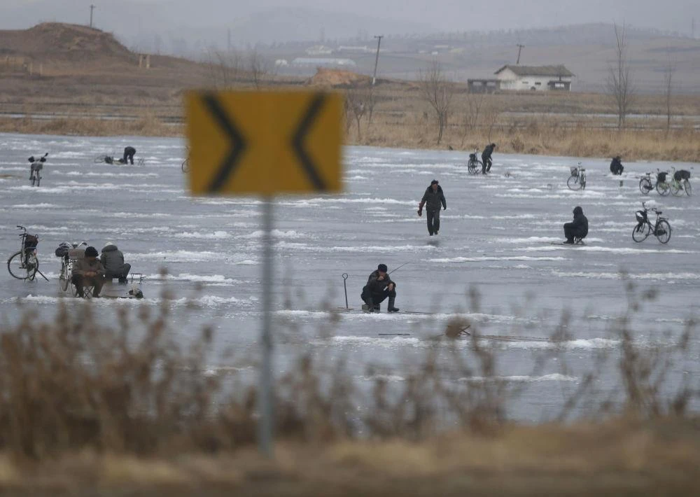 Người dân câu cá trên hồ nước đóng băng ở Nampo hôm 2-2. Ảnh: AP