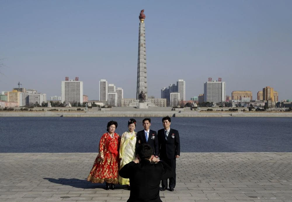 Một gia đình chụp ảnh cưới ở Tháp Juche Idea ở thủ đô Bình Nhưỡng. Ảnh: AP