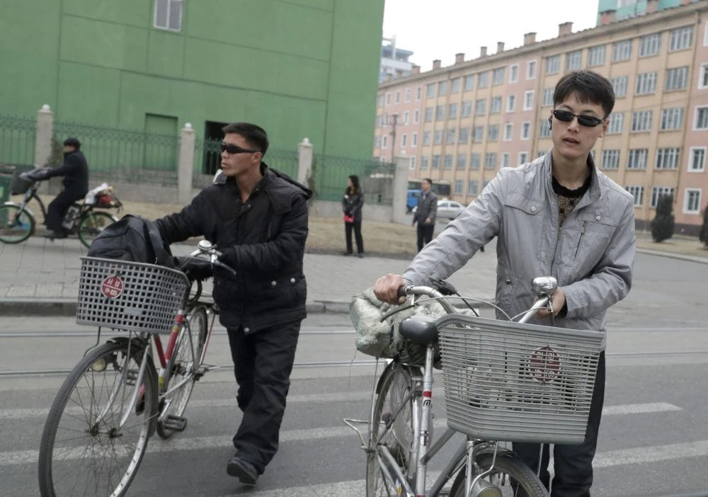 Những người đàn ông Triều Tiên dắt xe đạp khi sang đường ở Bình Nhưỡng. Ảnh: AP