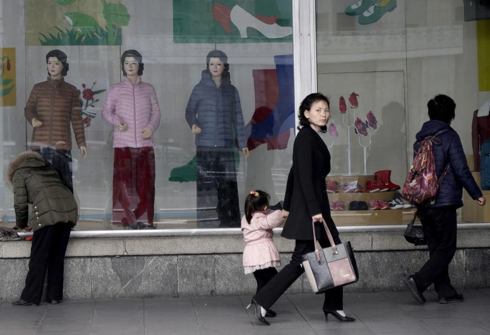Người phụ nữ cùng đứa con nhỏ đi qua một cửa hàng thời trang ở Bình Nhưỡng hôm 11-3. Ảnh: AP