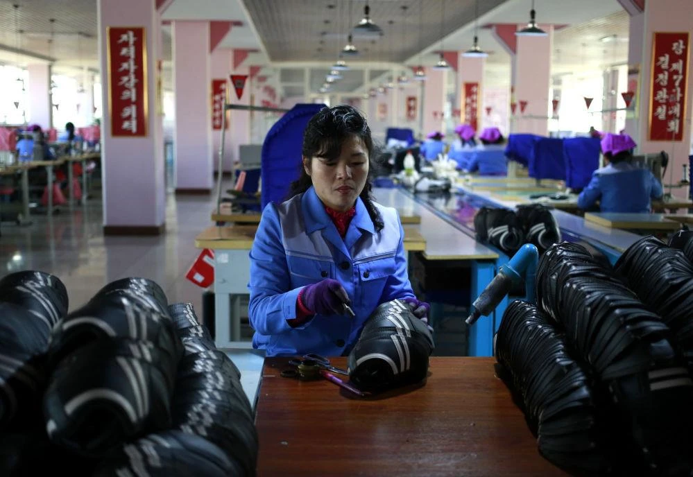 Một nữ công nhân Triều Tiên tại nhà máy đóng giày Ryuwon ở Bình Nhưỡng hôm 1-2. Ảnh: AP