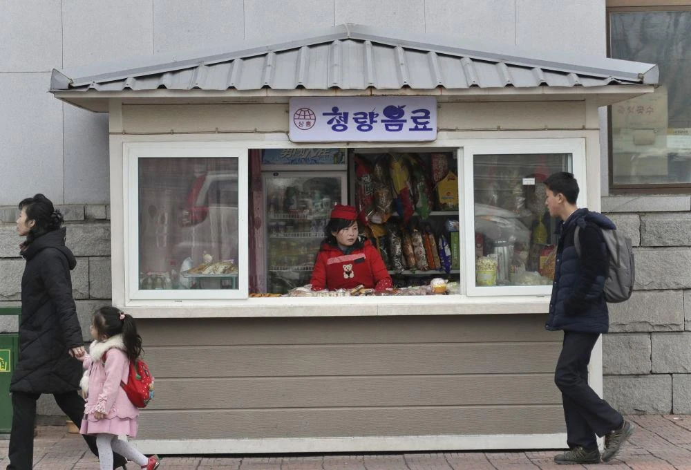 Người dân đi qua một quầy bán đồ ăn nhanh ở Bình Nhưỡng hôm 9-3. Những ki-ốt như thế này là khung cảnh phổ biến ở Bình Nhưỡng, có một số quầy bán thức ăn, nước uống, thậm chí bán cả hoa giả. Ảnh: AP