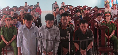 Bị cáo Hiền (thứ hai từ phải qua) và các bị cáo tại phiên tòa lưu động ngày 16-6. Ảnh: CTV