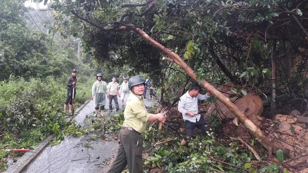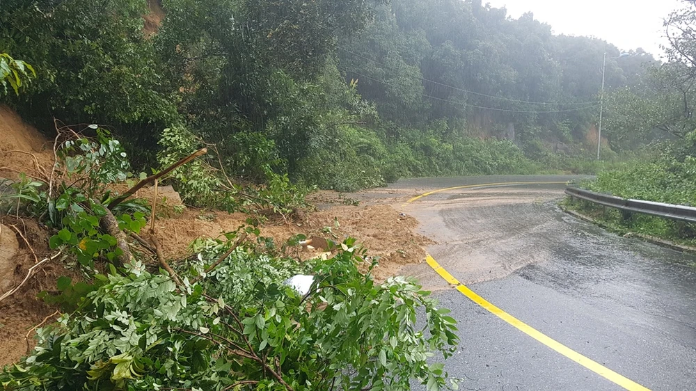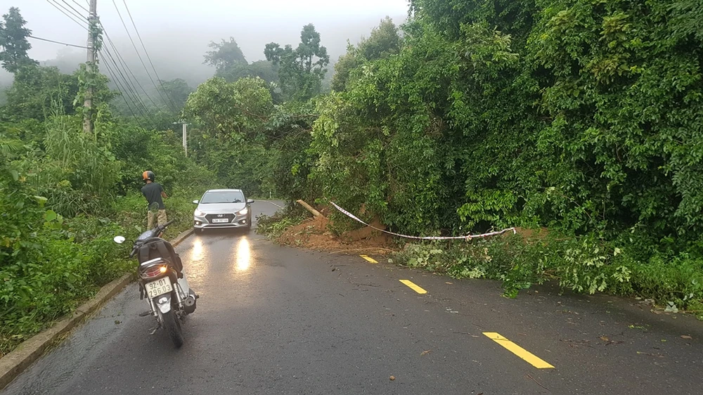 Cây đổ kèm đất đá tràn xuống đường lên đỉnh Bàn Cờ. Ảnh: TẤN VIỆT