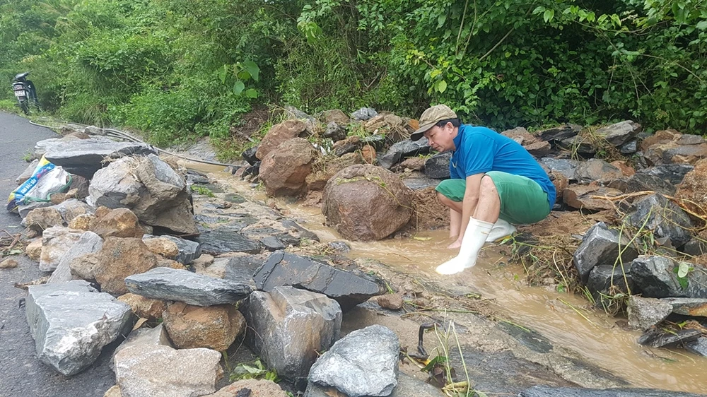 Mưa lớn cũng gây xói lở mương thoát nước dọc đường đèo, nước tràn lên cắt ngang mặt đường, gây sạt cả taluy âm và taluy dương.
