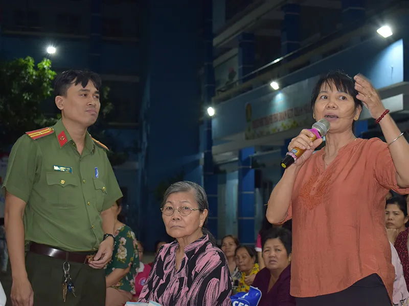 Thiếu tá Lưu Việt Tiến chia sẻ kinh nghiệm chống trộm cắp, cướp giật với người dân. Ảnh: NGUYỄN TRÀ
