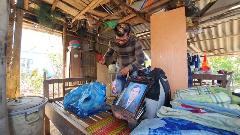 Anh Trương Văn Hải lắp lại di ảnh của cha đã bạc màu vì thấm nước mưa