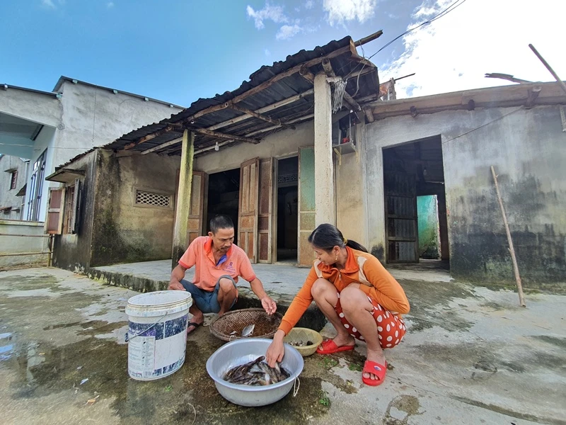 Vợ chồng anh Trần Văn Thu (43 tuổi, ngụ xã Duy Trung, Duy Xuyên, Quảng Nam) với mớ cá tôm vừa bắt được, đằng sau là căn nhà chờ sập