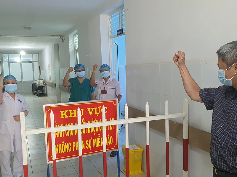 Thứ trưởng Bộ Y tế Nguyễn Trường Sơn động viên cán bộ y tế chăm sóc bệnh nhân COVID-19 tại khu điều trị cách ly TTYT Bình Sơn Cơ sở 2, tỉnh Quảng Ngãi. Ảnh: TUẤN DŨNG