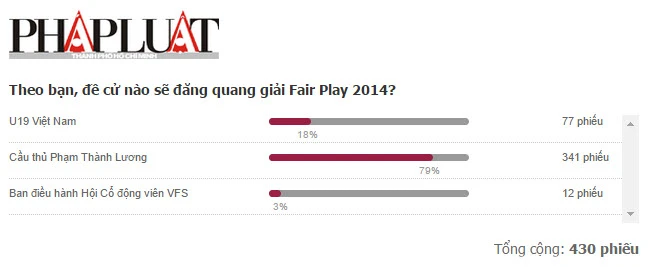 Một ngày trước lễ trao giải, báo điện tử Pháp luật TP. HCM đã lấy ý kiến thăm dò bạn đọc đề cử sẽ thắng giải FairPlay 2014. Theo kết quả tính đến 9 giờ sáng nay, cầu thủ của HN T&T Thành Lương đang dẫn đầu tuyệt đối với 341 bạn đọc bình chọn, đạt tỉ lệ đến 79%. U19 Việt Nam (nòng cốt là các cầu thủ thuộc học viện HAGL Arsenal JMG), đội bóng đăng quang giải FairPlay năm ngoái đang đứng thứ 2 khi nhận được 77 phiếu bình chọn (18%). Cuối cùng, đứng ở vị trí thứ 3 là Ban điều hành hội CĐV Việt Nam (VFS) với 12 phiếu (3%).
