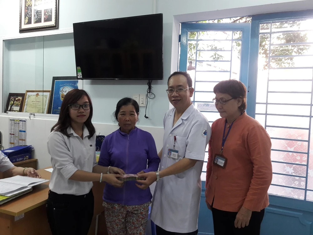 Đại diện báo Pháp Luật TP.HCM trao tiền cho gia đình và Phòng CTXH BV Nhi đồng 1. Ảnh: HẢI ÂU