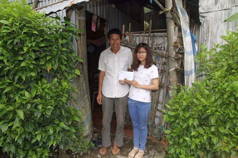 Phóng viên báo Pháp luật TP.HCM văn phòng đại diện tại ĐBSCL trao số tiền bạn đọc hỗ trợ mẹ con anh Đợi. Ảnh: HD