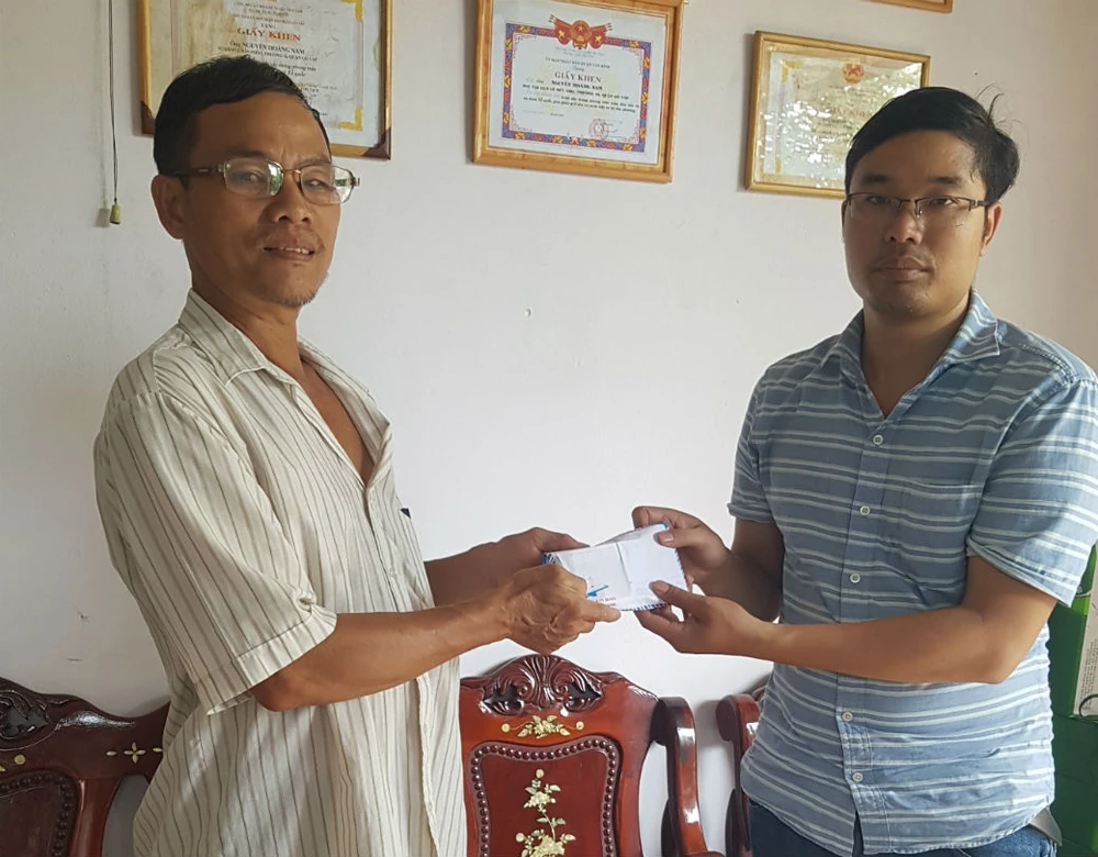 Đại diện báo Pháp Luật TP.HCM trao tiền cho gia đình hiệp sĩ Nguyễn Hoàng Nam.