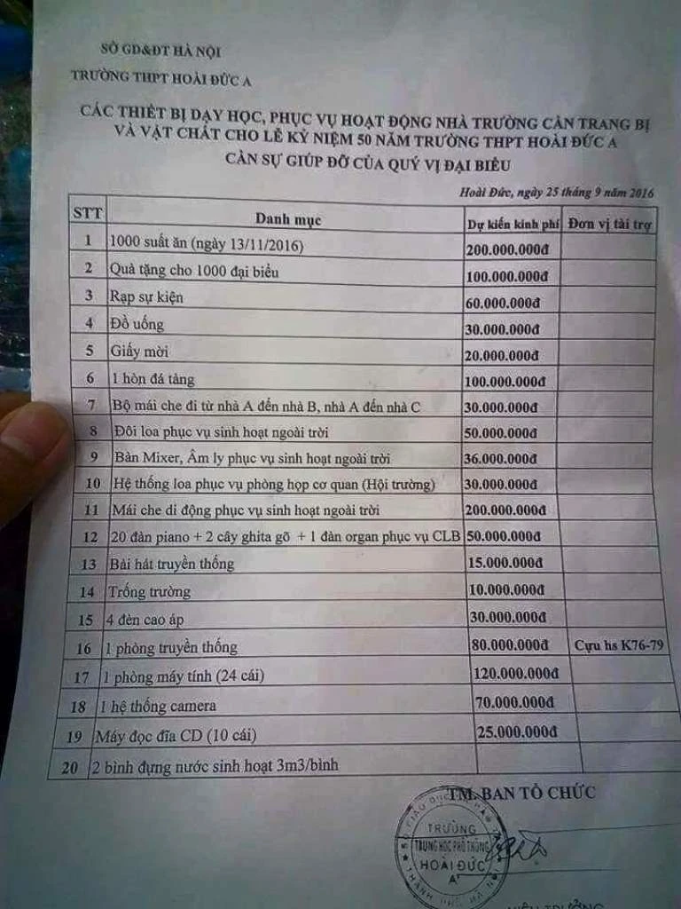 Bản danh sách có tên: “Các thiết bị dạy học, phục vụ hoạt động nhà trường cần trang bị và vật chất cho lễ kỷ niệm 50 năm Trường THPT Hoài Đức A cần sự giúp đỡ của quý vị đại biểu”.
