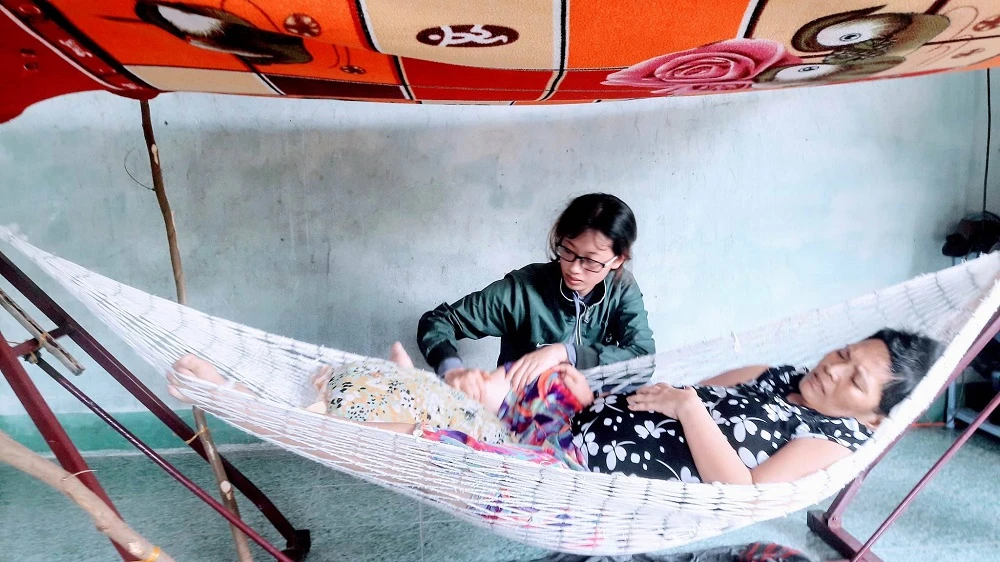 Về nhà, hàng ngày chị Nghiêm chỉ có thể nằm võng, đi lại phải có người dìu. Những cơn đau dày vò chị cả ngày lẫn đêm khiến anh Bằng không nỡ bỏ đi đâu. Hai người con cũng bỏ thành phố về quê tìm việc để gần gũi chăm sóc mẹ. Thế nhưng, ở quê việc làm thì khó, tiền lại ít, nhọc nhằn trăm bề.