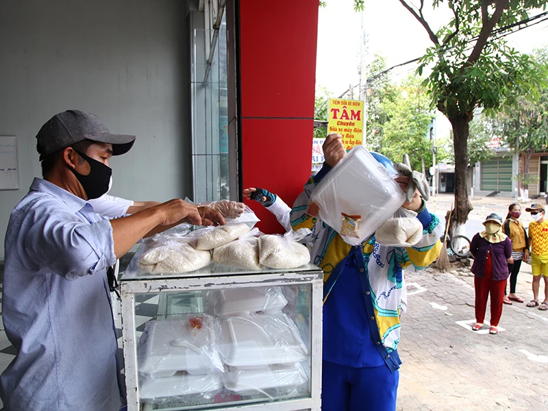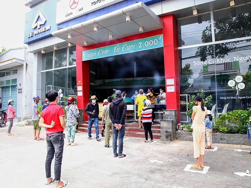 “Cực chẳng đã mới phải ghé đây, anh ạ! Tui làm mướn ở một nhà hàng, thường ngày chịu khó, chắt chiu cũng đủ nuôi con, nay quán đóng cửa và cho nhân viên nghỉ làm nên thực sự là khó khăn, không biết kiếm tiền đâu ra. Được cái anh chị em ở quán Nụ Cười rất vui vẻ giúp đỡ mọi người và mua cơm, gạo giá rẻ nên tới ăn và mang gạo về cũng bớt tủi thân”. Chị PTH, 42 tuổi, nhà ở phường Kinh Dinh, nói sau lớp khẩu trang. Chị có chồng bị tai nạn giao thông mất, một mình nuôi hai con nhỏ và đang phải gồng mình đi qua mùa dịch.