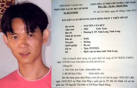 Nạn nhân Nguyễn Văn Đức (ảnh trái) khi còn sống (Ảnh do gia đình nạn nhân cung cấp). Bản kết luận bổ sung giám định pháp y ngày 2-3-2015 của Phân viện Pháp y quốc gia tại TP.HCM (hơn hai tháng sau, cán bộ CQĐT VKSND Tối cao mới tới nhận). Ảnh: Đ.TRÍ