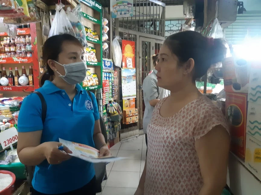 Nhân viên Bưu điện TP.HCM tư vấn những chính sách cho tiểu thương ở chợ Đa Kao. Ảnh: N.HIỀN