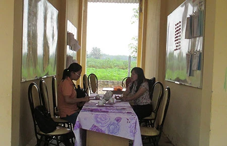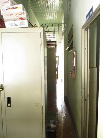 Cô Kim Chi vui vẻ cho biết: “Được như vầy là đỡ rồi đó. Năm ngoái, nhà trường được phụ huynh mua tôn lợp trên cái hành lang này nên chúng tôi mới ngồi đây làm việc được. Trước đó, bàn làm việc của hiệu trưởng kê ngay ngoài mái hiên, nắng rọi tới đâu phải dời bàn tới đó”.