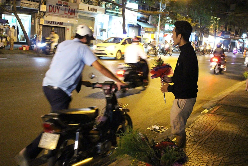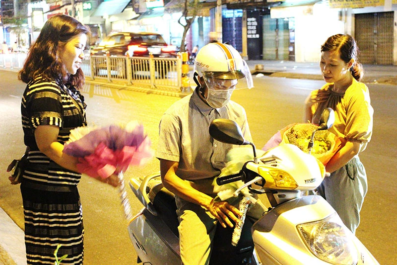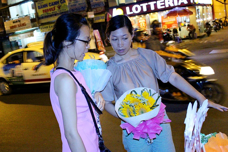 Chị Lê Thu Vân (bìa phải) đích thân đứng ngoài đường bán hoa gây quỹ, đêm 7-3. Ảnh: LÊ THOA