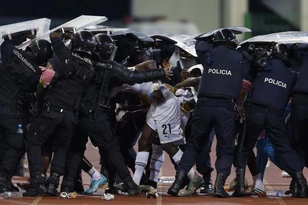 Trọng tài phải cho tạm dừng trận đấu, các cầu thủ Ghana tập trung vào giữa sân trong sự bảo vệ tuyệt đối của cảnh sát chống bạo động. Bên cạnh đó hàng trăm cổ động viên của đội khách Ghana cũng được tạm thời cho dồn vào mặt sân để tránh sự tấn công của cổ động viên chủ nhà có thể dẫn đến thương vong.