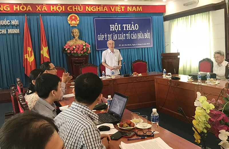 Sáng 6-4, Đoàn đại biểu Quốc hội (ĐBQH) TP.HCM tổ chức hội thảo góp ý dự án Luật tố cáo (sửa đổi) trình Quốc hội thông qua tại kỳ họp thứ 5, khóa XIV. Phó đoàn chuyên trách đoàn ĐBQH TP Phan Nguyễn Như Khuê chủ trì hội thảo.