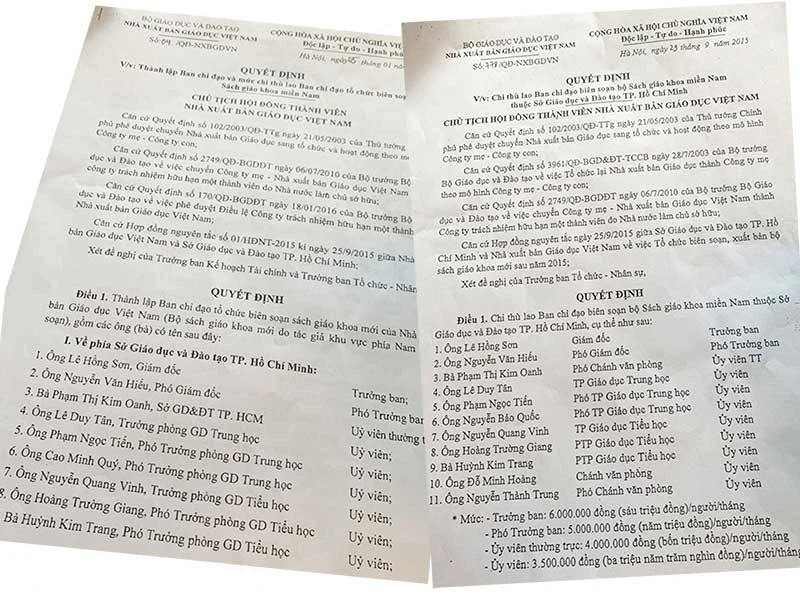| Từ năm 2015 đến 2018, NXB Giáo dục Việt Nam có hai quyết định chi thù lao cho ban chỉ đạo tổ chức biên soạn bộ SGK miền Nam, trong đó hầu hết là lãnh đạo và cán bộ, chuyên viên của Sở GD&ĐT TP.HCM. Ông Lê Hồng Sơn - Giám đốc nhận 6 triệu đồng/tháng, những người khác nhận 2,5-5 triệu đồng/tháng. |