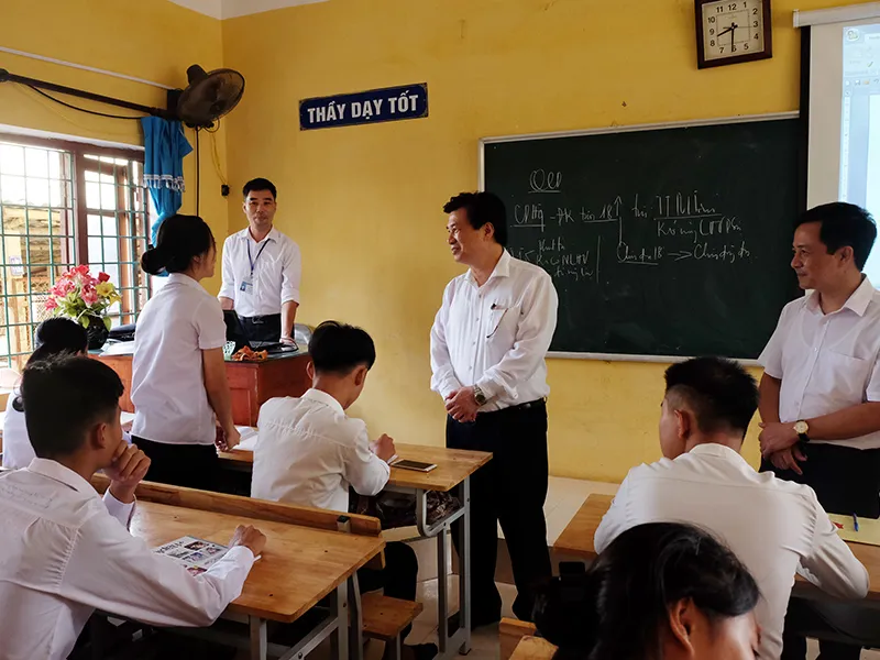 Thứ trưởng Nguyễn Hữu Độ thăm học sinh lớp 12 Trường THPT Bình Yên, Thái Nguyên trong đợt kiểm tra công tác chuẩn bị kỳ thi THPT ngày 8-7. Ảnh: TTTT