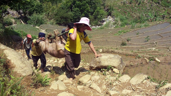 Những người Xê Đăng cõng heo ngược núi lên làng - Ảnh: Thái Bá Dũng