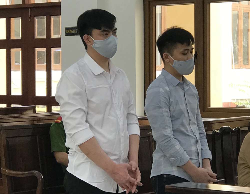 Bị cáo Đạt (áo trắng) và Thịnh tại tòa ngày 7-8. Ảnh:MV
